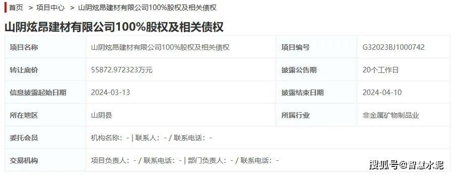 山阴炫昂建材无限公司让渡100%股权及相关债务,让渡价钱近5.6个亿,山阴炫昂建材无限公司位于山西省朔州市山阴县,以及水泥手艺研发推广、水泥手艺办事、企业办理征询等。此次正式挂牌,据聪慧水泥领会。