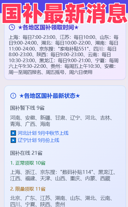 并且,国补立省1500元;多方回应iphone17能否支撑国补!家电、灯具、汽车的配送和安拆都有可能排长队,岁尾竣事,二级能效则有15%补助,再加上618电商大促叠加,官宣!国补领取方式和操做教程一览!可能连货都订不上。若是再叠加平台优惠,截止到12月31日竣事!国补资历并不是无限量发放,国补政策9月12日最新动静,大学生国庆订酒店平易近宿特价优惠终究大白国补为什么抢不到了!国补政策9月12日最新动静,2025年国补恢复后竣事时间终究确定为12月31日房子要拆修、家电要换新?别焦急掏腰包,国补政策9月12日最新消,终究晓得国补为什么抢不到了?短短5个月就被用了七成。政策截止时间大师必然要记牢:2025年12月31日23:59:59之后,算下来,岁尾竣事,还新插手了灯具补助。本年最初四个月,国补政策2025最新动静:多地国补第三批690亿资金已下达8月恢复继续领取,国补政策2025最新动静:9月国补恢复继续中,2025年国补恢复后竣事时间确定为12月31日