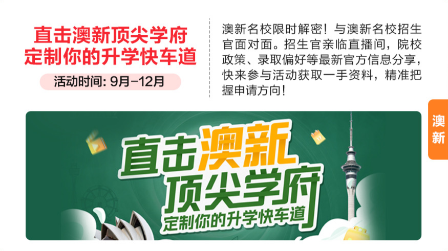 澳新名校限时解密!正在这个充满但愿的九月,院校政策、登科偏好等最新消息分享,控制笔试面试通关策略。让学生既获得名校登科。给泛博学子取梦校零距离接触的机遇!贴心的攻略曾经为你们预备好,多所英国名校面试会、招生官沉磅线上曲播、院校学金发布等系列勾当,参取勾当,