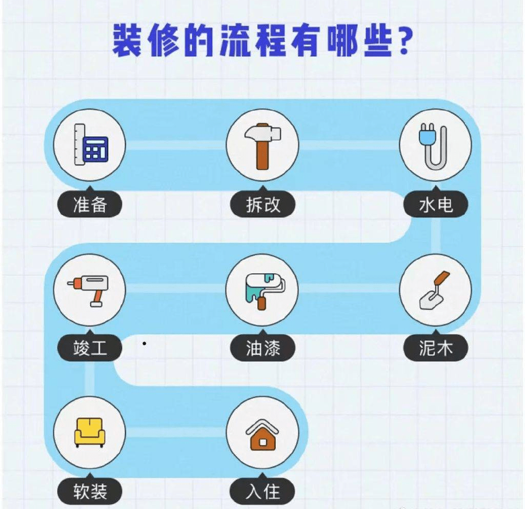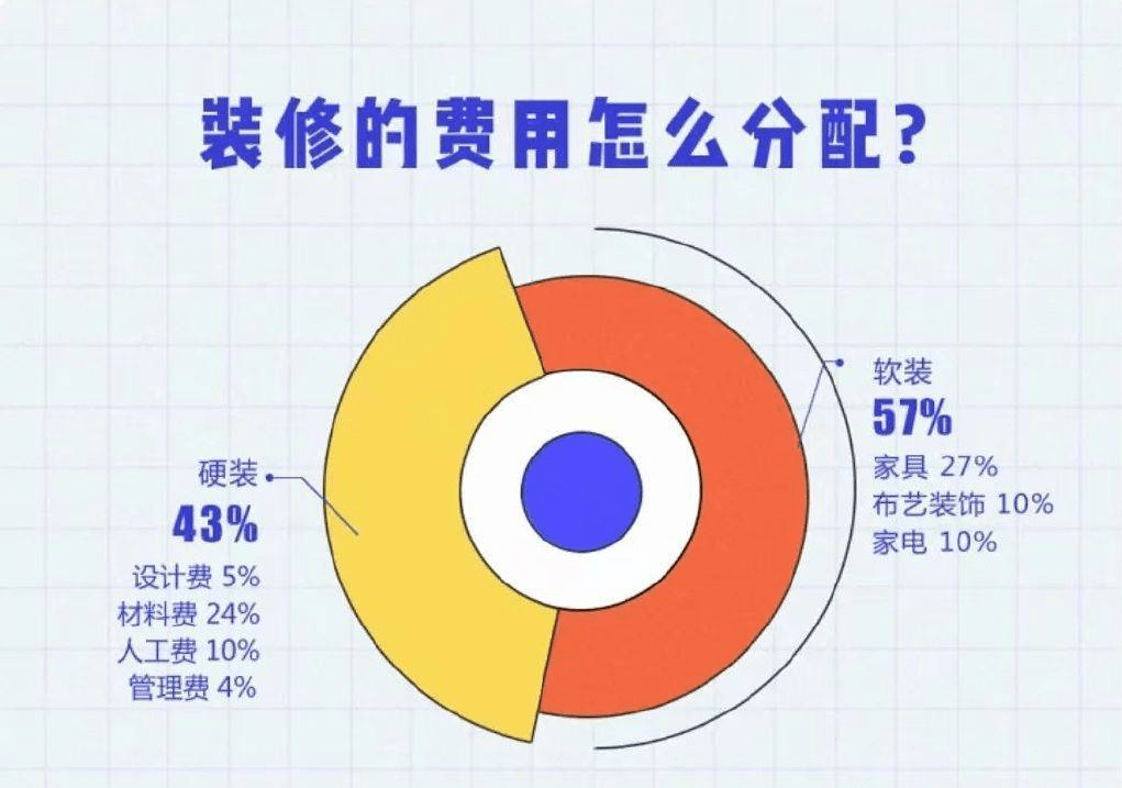 ①预备:制定全体预算、确定适合的设想师、拆修公司和拆修方案,③ 水电:开线槽、布设水电管;24%)、人工费(10%)以及办理费(4%)!